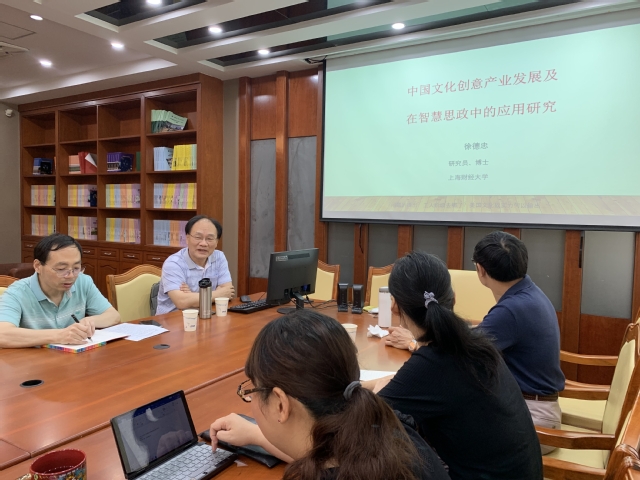 6月11日上午,马克思主义与文化研究系列讲座(五)——“中国文化创意产业发展及其在智慧思政中的应用研究”在明华楼教师发展中心如期开展。本场讲座特邀上海财经大学国际儒商高等研究院特聘研究员、上海金融信息科技有限公司董事长徐德忠作为主讲嘉宾,马院特聘教授鞠立新担任点评人,马院沈尚武副教授担任主持人,马院副院长丁彩霞及专兼职教师参与了本场讲座。