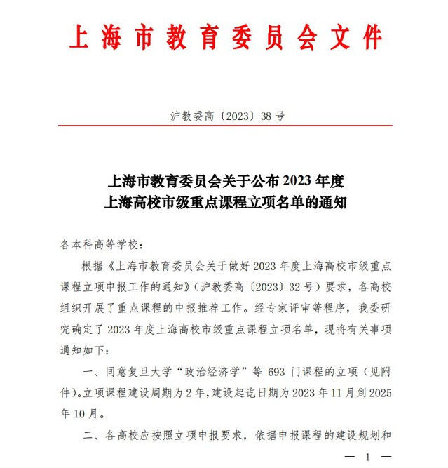 近日,上海市教育委员会公布 2023年度上海市高校市级重点课程建设立项名单,我院《思想道德与法治》课程获得立项。