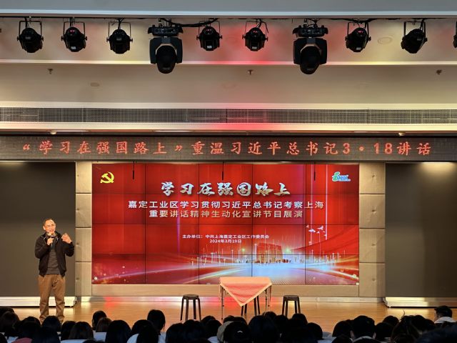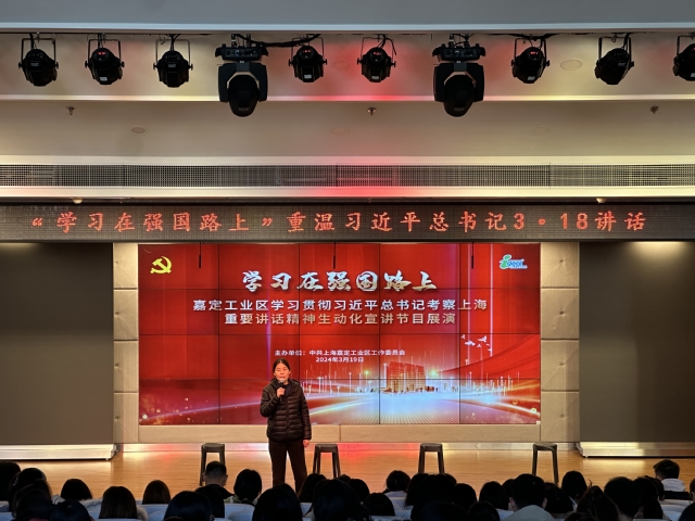 为纪念习近平总书记在学校思想政治理论课教师座谈会上发表重要讲话五周年,3月19日上午,我院与嘉定工业区携手举办了一场主题为“学习在强国路上”的主题宣讲活动。此次活动由我院副院长丁彩霞主持,校党委宣传部部长齐砚奎,院长助理张旭及部分思政课教师共同参加,以“曲艺+宣讲”的创新形式,重温了习近平总书记“3•18”重要讲话精神。