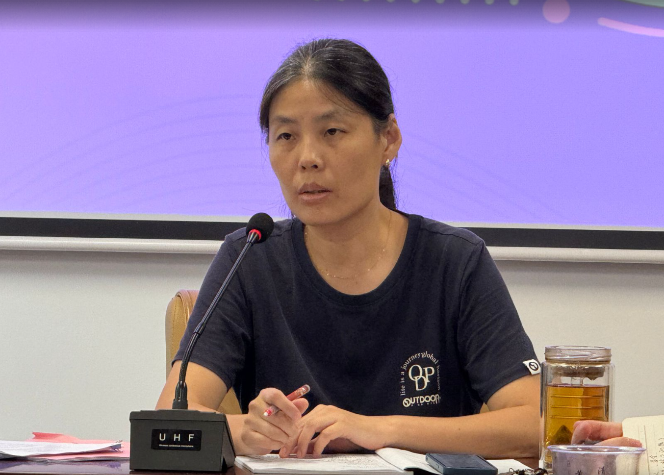 随后,丁彩霞副院长对本学期我院教学工作进行了安排与布置,提醒各教师做好学期初教学的相关准备工作,注意上课时间与上课纪律、调停课程序规范、教学材料归档检查等常规性教学安排。同时,丁院长强调本学期需着重学院落实教师教学比赛的举办、案例教学的设计与实践、AI赋能思政课教学以及市级重点课程的申报与建设等,希望教师们加强内部学习交流,推动各项工作顺利进行。