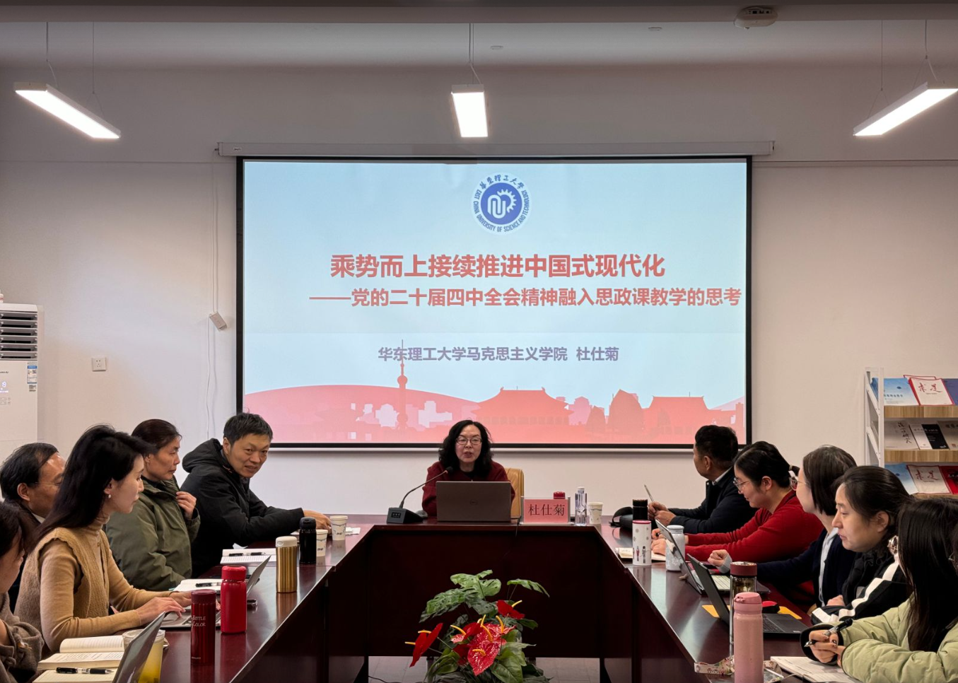 2025年12月12日上午,华东理工大学马克思主义研究院首席专家、博士生导师,杜仕菊教授,应邀在月华楼114会议室为我院教师开展了主题为“乘势而上接续推进中国式现代化——党的二十届四中全会精神融入思政课教学的思考”的讲座。此次讲座由天华学院英国正版365首页刘天翔院长主持,副院长丁彩霞及部分专任教师参加。