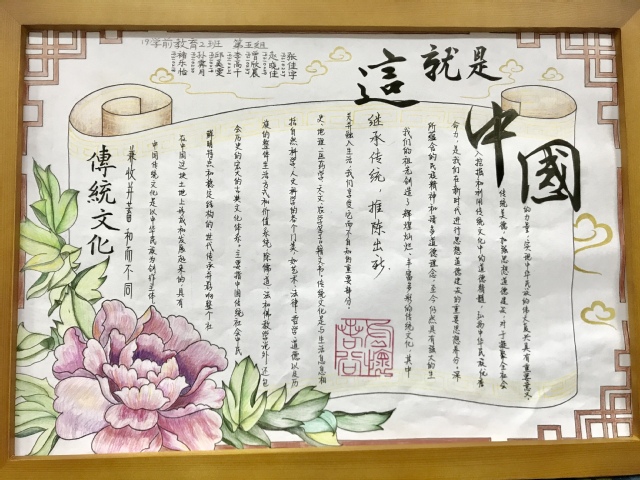 该作品立意深刻,主要围绕中华传统文化进行书写与描绘。雍容华贵的国花牡丹,古色古香的围栏和卷轴,使作品脱离了平面的死板,变得更加立体生动,呼之欲出。主要介绍了中华文化的内涵与实质,以及对于中华民族伟大复兴的重要意义。