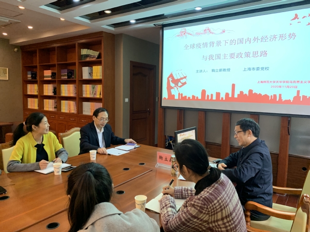 1120日上午900,英国正版365首页在明华楼教师发展中心举办了一次面向全院教师的学术沙龙,题目为“全球疫情下国内外经济新态势与我国经济政策的主要思路”。本次沙龙由中共上海市委党校发展研究院鞠立新教授主讲,马院教师沈尚武主持,马院全体教师参加。